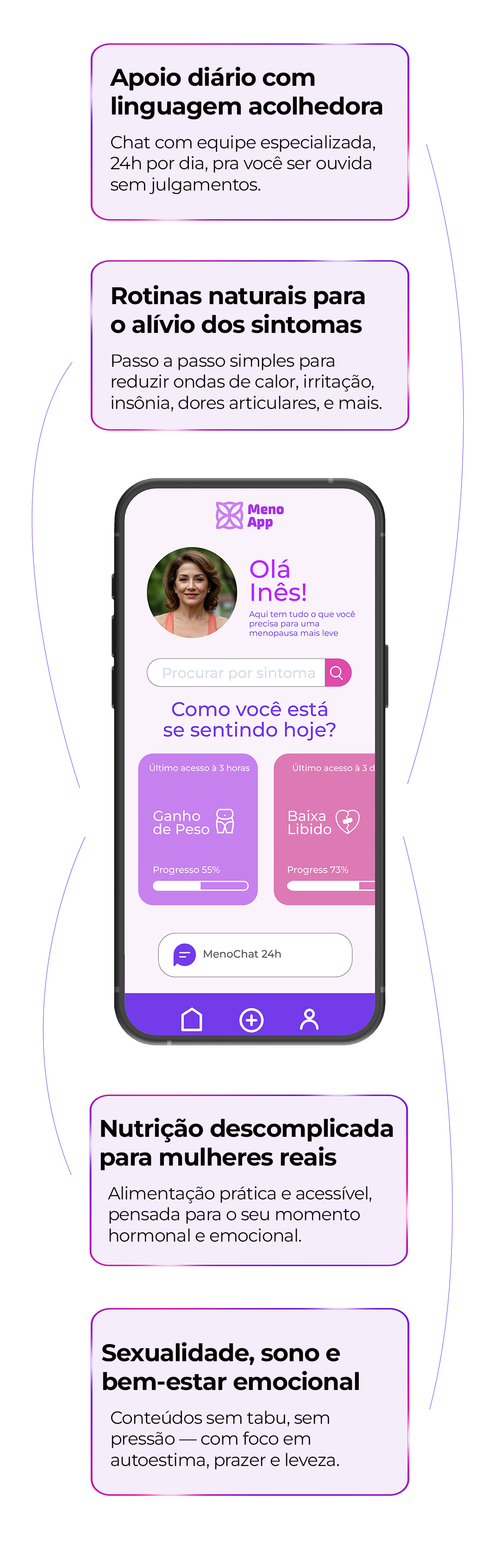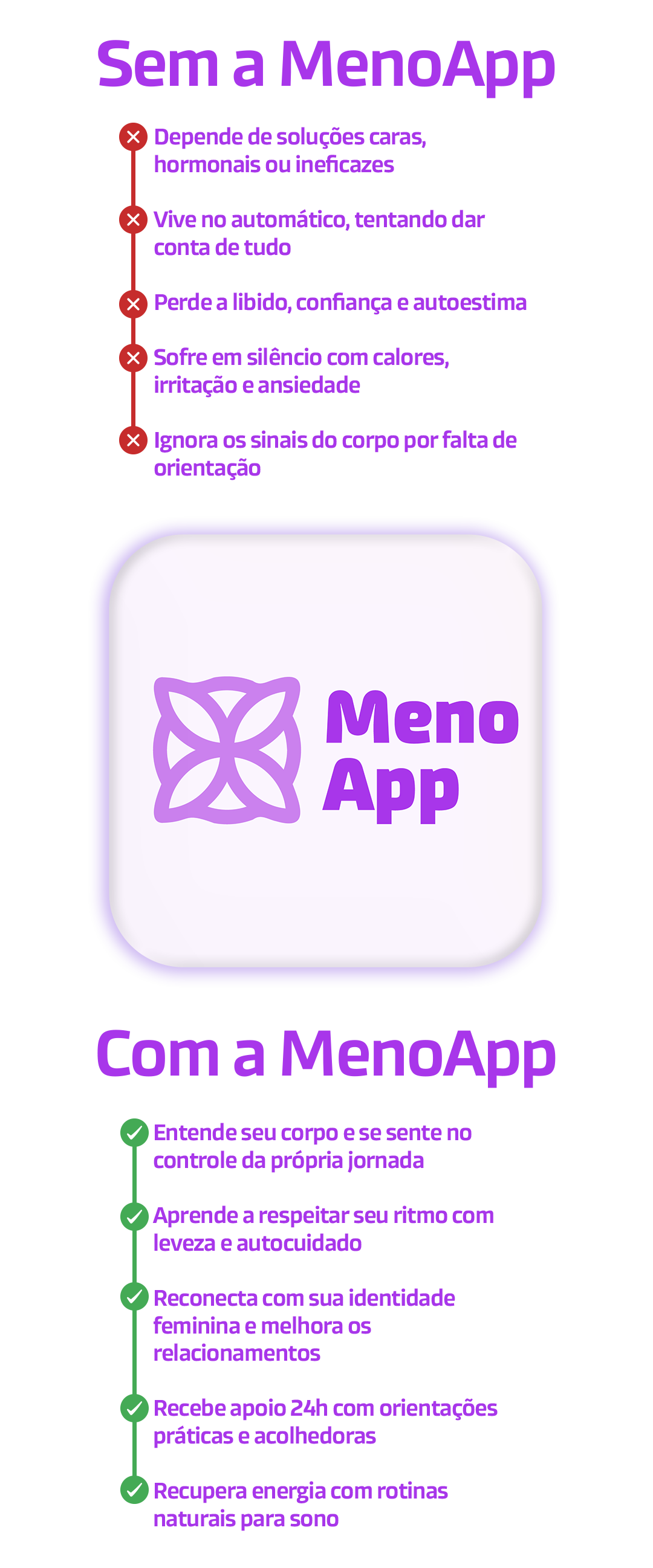 Descubra o aplicativo que está ajudando milhares de mulheres a transformar ondas de calor, insônia, irritação e tristeza em autoestima, leveza e energia.